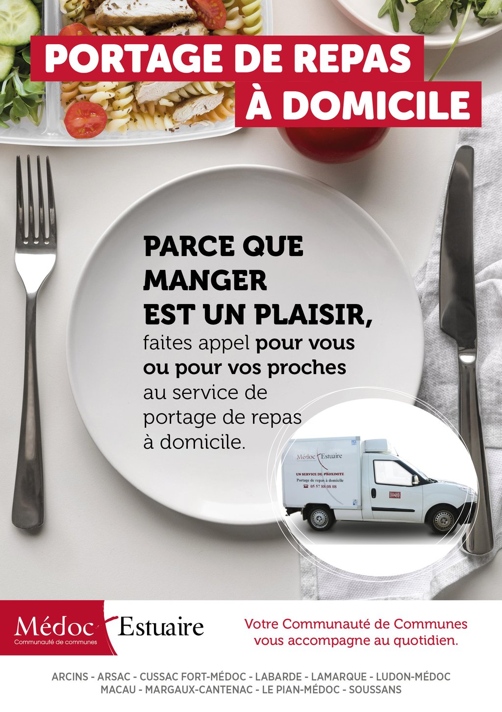 Le service Portage de repas permet d’assurer un repas 7 jours sur 7 à destination des personnes âgées, porteuses de handicap ou momentanément en perte d’autonomie et résidant sur le territoire de la Communauté de Communes Médoc Estuaire (Arcins, Arsac, Cussac Fort-Médoc, Labarde, Lamarque, Ludon-Médoc, Macau, Margaux-Cantenac, Le Pian-Médoc, Soussans).