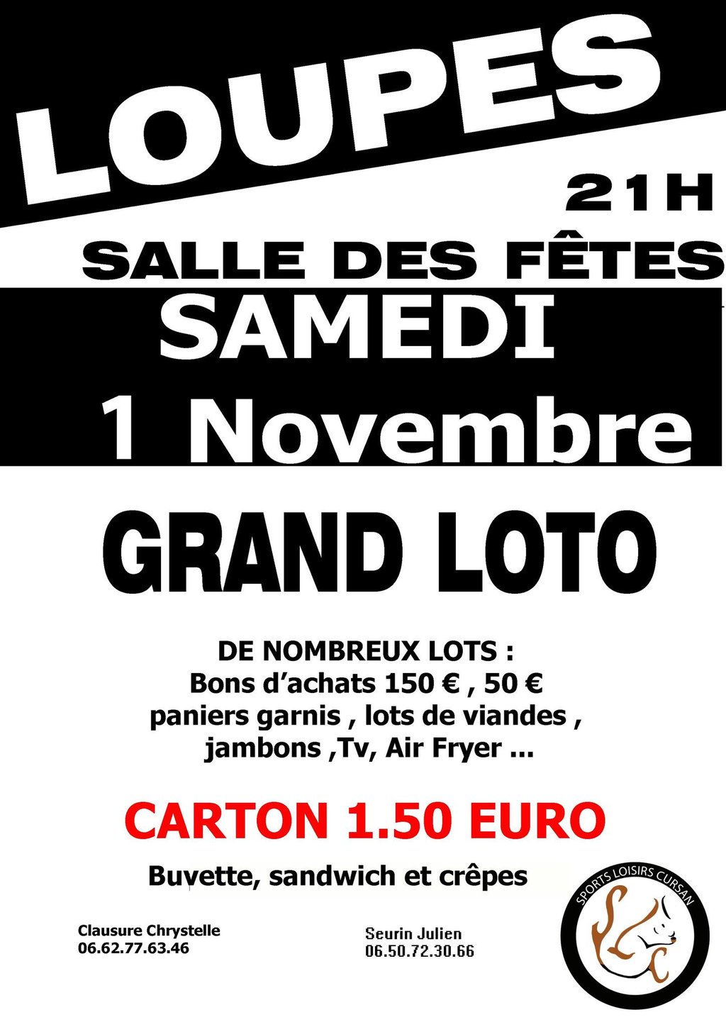 L'association "Sports Loisirs Cursan" vous donne rendez-vous le samedi 1er novembre à la salle des fêtes de Loupes pour son grand loto annuel.